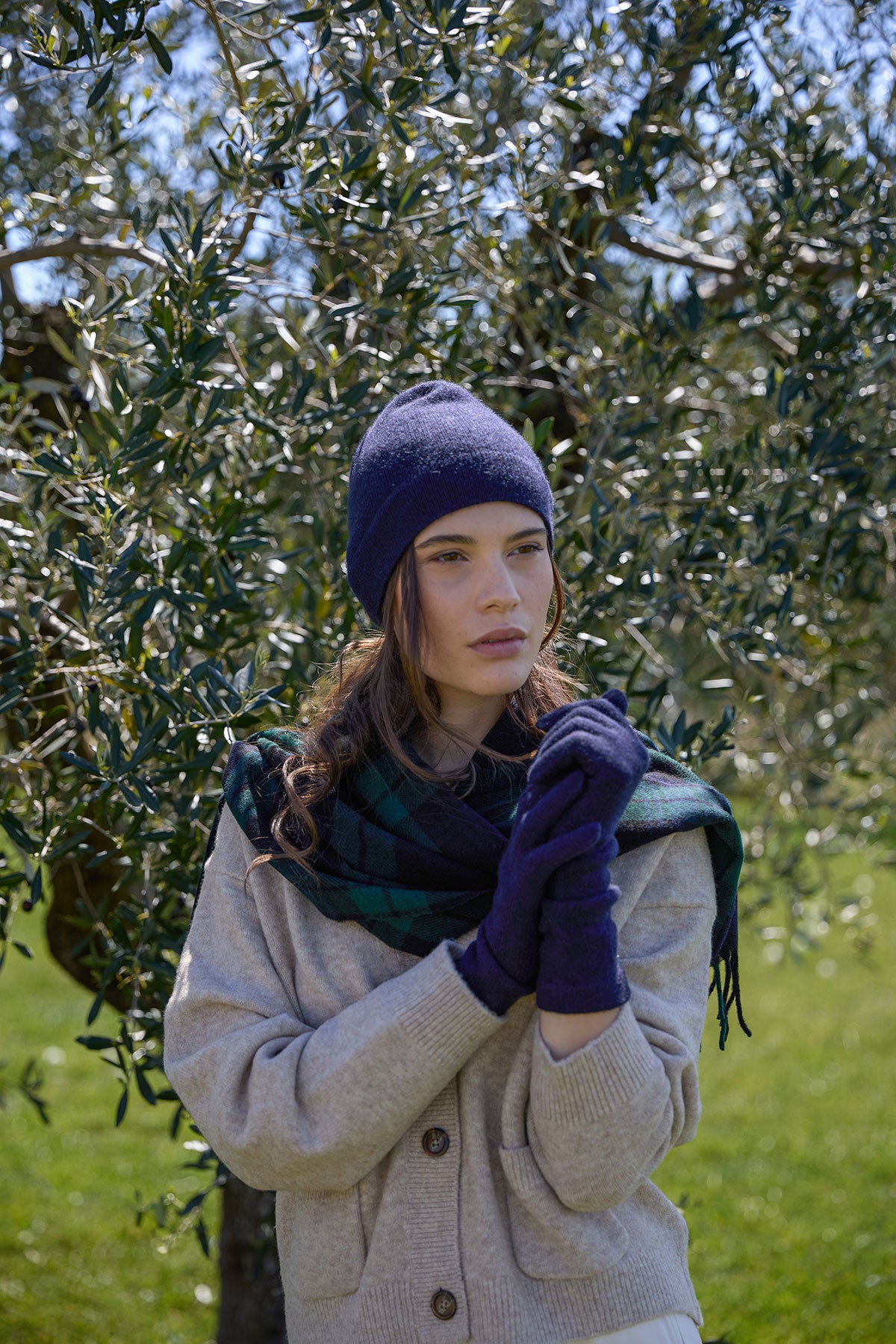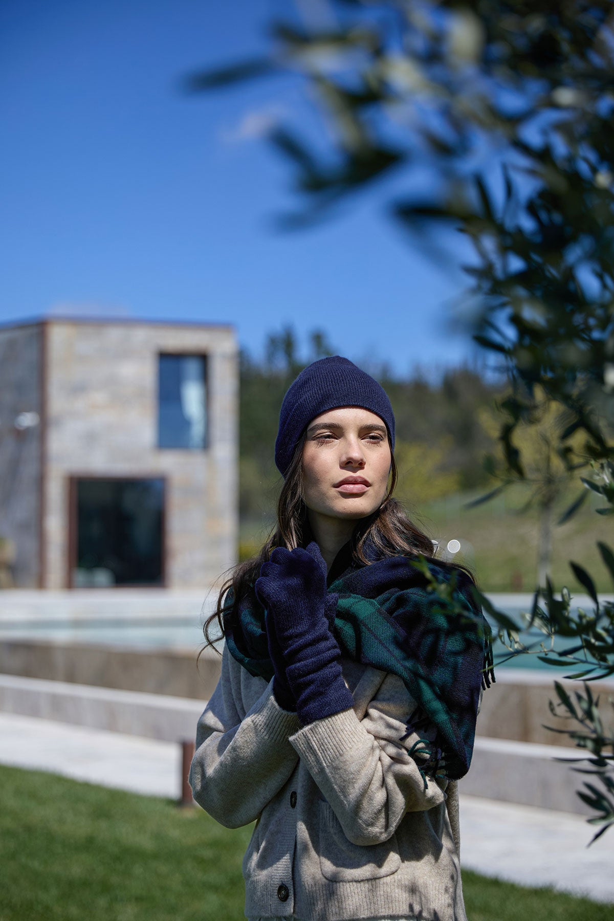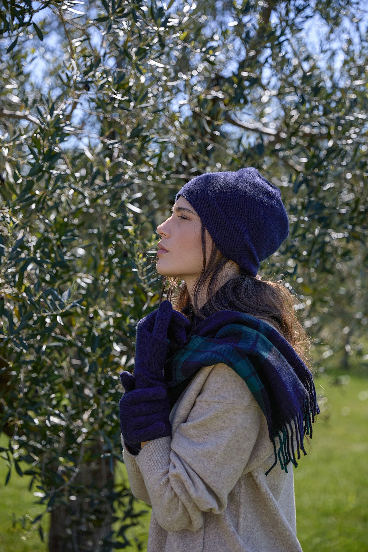 Completing the set are the Elisa hat and gloves in deep blue pure cashmere, crafted from the noble fibers of the Mongolian highlands. Soft and enveloping, they offer an experience of understated luxury; the gloves, with their slightly longer length, add a touch of elegance and character.